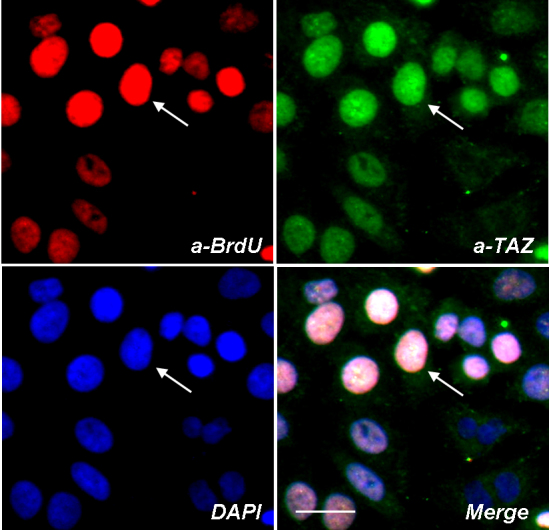 Methods: Conjunctiva epithelial cells were cultured in keratinocytes growth medium and treated with transformation growth factor β (TGFβ) to analyze the expression and translocation of TAZ protein by immunostaining and BrdU analysis. Immortalized conjunctiva epithelial cells (NHC) were treated with TGFβ, targeting siRNA, TGFβ receptor antibody or TGFβ receptor inhibitor, to study the involvement of TAZ and TGFβ signaling pathway in conjunctiva cell proliferation by cell adhesion assay. Conjunctiva tissues from a normal human eye and an eye with pterygium disease were collected for histological analyses and western blot to evaluate the TAZ protein expression in vivo.