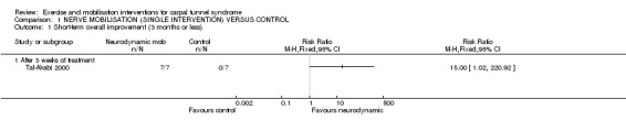 Main results: Sixteen studies randomising 741 participants with CTS were included in the review. Two compared a mobilisation regimen to a no treatment control, three compared one mobilisation intervention (for example carpal bone mobilisation) to another (for example soft tissue mobilisation), nine compared nerve mobilisation delivered as part of a multi-component intervention to another non-surgical intervention (for example splint or therapeutic ultrasound), and three compared a mobilisation intervention other than nerve mobilisation (for example yoga or chiropractic treatment) to another non-surgical intervention. The risk of bias of the included studies was low in some studies and unclear or high in other studies, with only three explicitly reporting that the allocation sequence was concealed, and four reporting blinding of participants. The studies were heterogeneous in terms of the interventions delivered, outcomes measured and timing of outcome assessment, therefore, we were unable to pool results across studies. Only four studies reported the primary outcome of interest, short-term overall improvement (any measure in which patients indicate the intensity of their complaints compared to baseline, for example, global rating of improvement, satisfaction with treatment, within three months post-treatment). However, of these, only three fully reported outcome data sufficient for inclusion in the review. One very low quality trial with 14 participants found that all participants receiving either neurodynamic mobilisation or carpal bone mobilisation and none in the no treatment group reported overall improvement (RR 15.00, 95% CI 1.02 to 220.92), though the precision of this effect estimate is very low. One low quality trial with 22 participants found that the chance of being 'satisfied' or 'very satisfied' with treatment was 24% higher for participants receiving instrument-assisted soft tissue mobilisation compared to standard soft tissue mobilisation (RR 1.24, 95% CI 0.89 to 1.75), though participants were not blinded and it was unclear if the allocation sequence was concealed. Another very low-quality trial with 26 participants found that more CTS-affected wrists receiving nerve gliding exercises plus splint plus activity modification had no pathologic finding on median and ulnar nerve distal sensory latency assessment at the end of treatment than wrists receiving splint plus activity modification alone (RR 1.26, 95% CI 0.69 to 2.30). However, a unit of analysis error occurred in this trial, as the correlation between wrists in participants with bilateral CTS was not accounted for. Only two studies measured adverse effects, so more data are required before any firm conclusions on the safety of exercise and mobilisation interventions can be made. In general, the results of secondary outcomes of the review (short- and long-term improvement in CTS symptoms, functional ability, health-related quality of life, neurophysiologic parameters, and the need for surgery) for most comparisons had 95% CIs which incorporated effects in either direction.