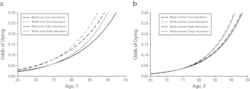 Results: Discrete-time hazard models showed that the association between low education and mortality did not vary by race or age and was only significant for men. For women, the effect of low income diminished with age and had little impact on the crossover. For men, low income varied by race and age, altering the Black-White crossover and producing low-high income crossovers at advanced ages.