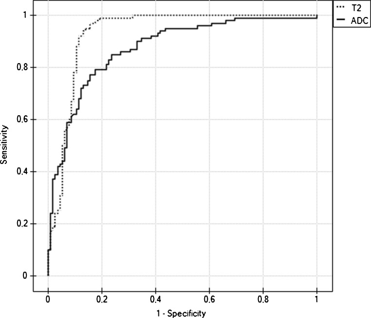 Results: The mean ADC value of malignant tumours (1.07 × 10(-3) mm(2)/s) was significantly lower (P < 0.05) than that of benign lesions (1.86 × 10(-3) mm(2)/s ); however, with the use of the optimal cut-off value of 1.25 × 10(-3) mm(2)/s, 20 false positive (FP) and 20 false negative (FN) diagnoses of malignancy were noted, generating 79 % sensitivity, 82.6 % specificity and 80.9 % accuracy. The mean T2 relaxation time of malignant tumours (64.4 ms) was significantly lower (P < 0.05) than that of benign lesions (476.1 ms). At the threshold of 107 ms 22 FP and 1 FN diagnoses were noted; the sensitivity was 99 %, specificity 80.9 % and accuracy 89.3 %.