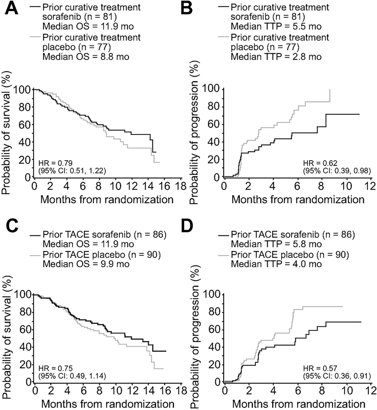 Results: Subgroup analyses showed that sorafenib consistently improved median OS compared with placebo, as reflected by hazard ratios (HRs) of 0.50-0.85, similar to the complete cohort (HR=0.69). Sorafenib also consistently improved median TTP (HR, 0.40-0.64), except in HBV-positive patients (HR, 1.03), and DCR. Results are limited by small patient numbers in some subsets. The most common grade 3/4 adverse events included diarrhea, hand-foot skin reaction, and fatigue; the incidence of which did not differ appreciably among subgroups.