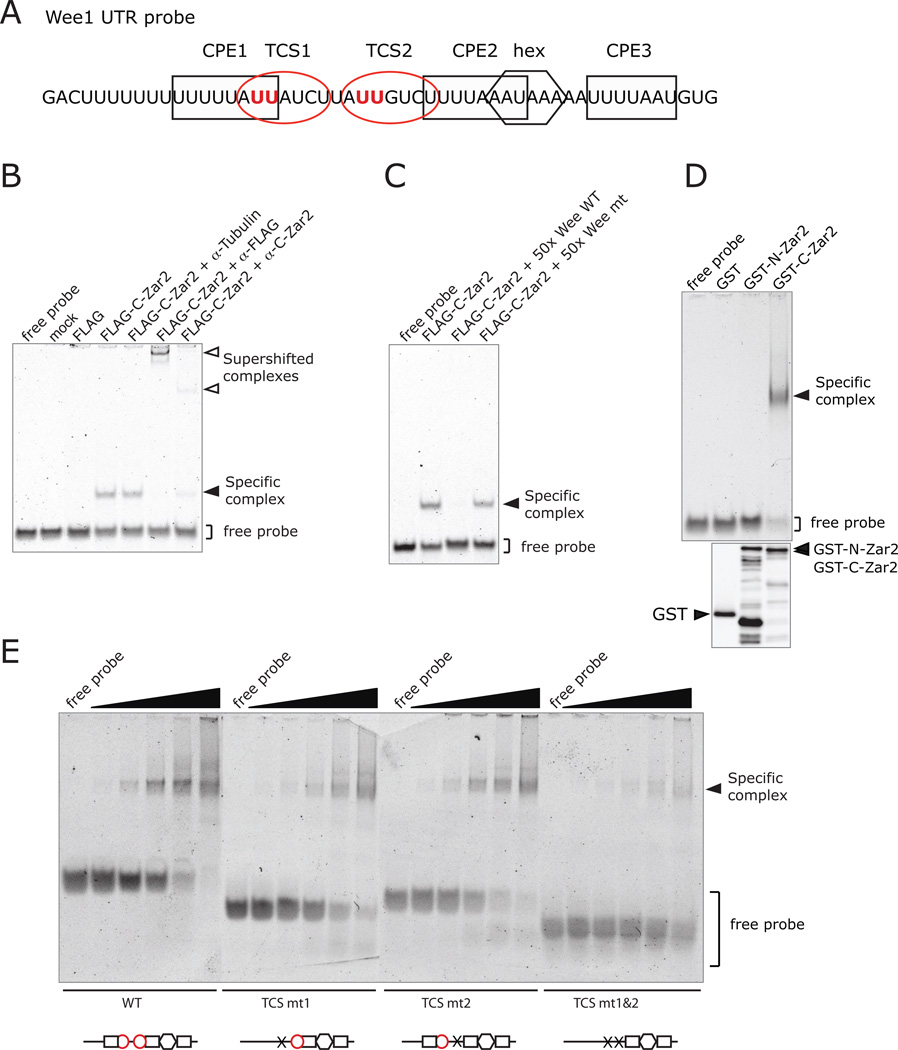 Zygote arrest (Zar) proteins are crucial for early embryonic development, but their molecular mechanism of action is unknown. The Translational Control Sequence (TCS) in the 3' untranslated region (UTR) of the maternal mRNA, Wee1, mediates translational repression in immature Xenopus oocytes and translational activation in mature oocytes, but the protein that binds to the TCS and mediates translational control is not known. Here we show that Xenopus laevis Zar2 (encoded by zar2) binds to the TCS in maternal Wee1 mRNA and represses translation in immature oocytes. Using yeast 3 hybrid assays and electrophoretic mobility shift assays, Zar2 was shown to bind specifically to the TCS in the Wee1 3'UTR. RNA binding required the presence of Zn(2+) and conserved cysteines in the C-terminal domain, suggesting that Zar2 contains a zinc finger. Consistent with regulating maternal mRNAs, Zar2 was present throughout oogenesis, and endogenous Zar2 co-immunoprecipitated endogenous Wee1 mRNA from immature oocytes, demonstrating the physiological significance of the protein-RNA interaction. Interestingly, Zar2 levels decreased during oocyte maturation. Dual luciferase reporter tethered assays showed that Zar2 repressed translation in immature oocytes. Translational repression was relieved during oocyte maturation and this coincided with degradation of Zar2 during maturation. This is the first report of a molecular function of zygote arrest proteins. These data show that Zar2 contains a zinc finger and is a trans-acting factor for the TCS in maternal mRNAs in immature Xenopus oocytes.