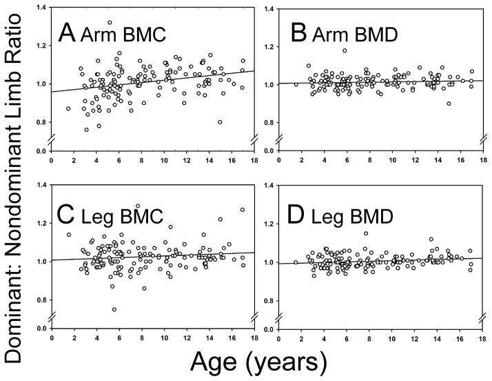 Results: Median age was 7.2 years (range, 1.5 to 17.0 years), 49 % was male, and the spine BMD Z-score was -0.9 (SD, 1.3). By linear regression, BMC sidedness in the arms was significantly related to age (r = 0.294, p = 0.0005). Breakpoint analysis revealed two lines with a knot at 6.0 years (95 % CI, 4.5-7.5 years). The formula for the first line was: dominant:nondominant arm BMC ratio = 0.029 × age [in years] + 0.850 (r = 0.323, p = 0.017). The slope of the second line was not different from 0 (p = 0.332), while the slopes for the two lines were significantly different (p = 0.027).