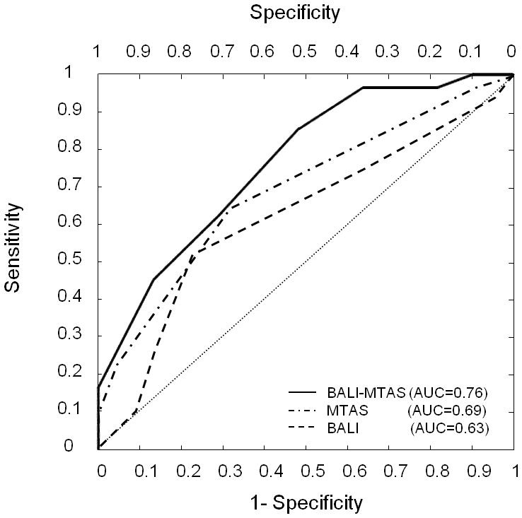 Results: The MTAS and BALI scores were closely correlated (r(2) > 0.56); each differed between the diagnostic groups. Having an unfavorable MTAS score was associated with an increased risk of MCI-AD conversion (OR = 3.71, p = 0.039), adjusted for age, sex, and education; having an unfavorable BALI score marginally contributed to such risks (OR = 4.08, p = 0.080). Combining MTAS and BALI components resulted in a greater OR (8.99, p = 0.007) and an improved predictive accuracy (75.9%, p = 0.002).