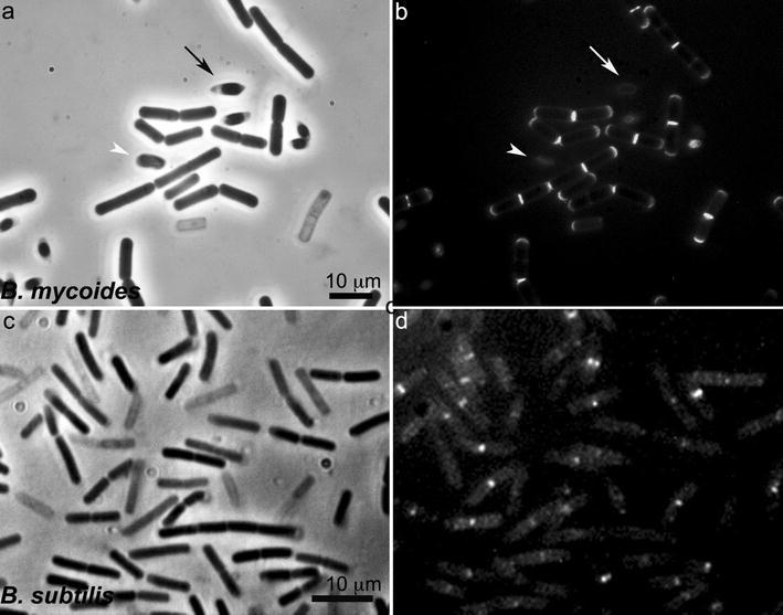 Bacillus mycoides is a sporogenic Gram-positive soil bacillus of the B. cereus group. This bacillus, which forms hyphal colonies, is composed of cells connected in filaments that make up bundles and turn clock- or counterclockwise depending on the strain. A thick peptidoglycan wall gives the rod cells of these bacilli strength and shape. One approach used to study peptidoglycan neoformation in Gram positives exploits the binding properties of antibiotics such as vancomycin and ramoplanin to nascent peptidoglycan, whose localization in the cell is monitored by means of a fluorescent tag. When we treated B. mycoides strains with BODIPY-vancomycin, we found the expected accumulation of fluorescence at the midcell septa and localization along the cell sidewall in small foci distributed quite uniformly. Intense fluorescence was also observed at the poles of many cells, more clearly visible at the outer edges of the cell chains. The unusual abundance of peptidoglycan intermediates at the cell poles after cell separation suggests that the construction process of this structure is different from that of B. subtilis, in which the free poles are rarely reactive to vancomycin.