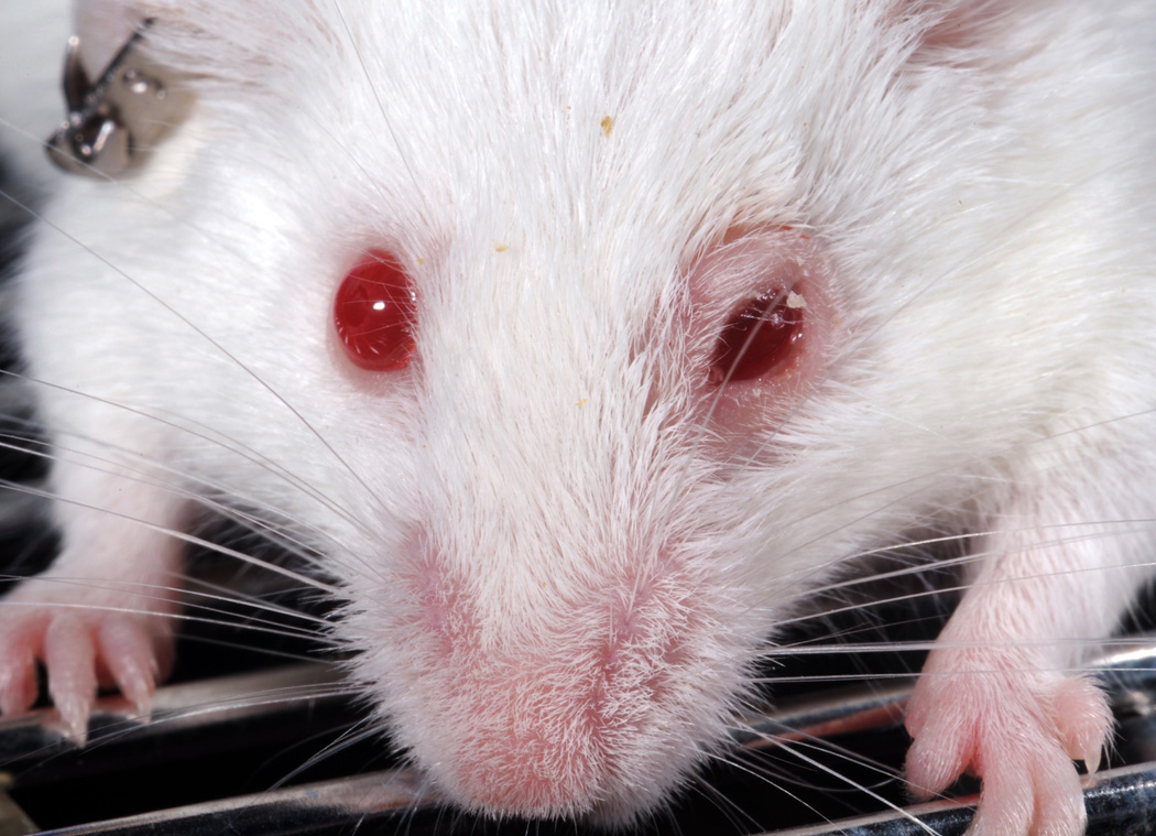 Facial expressions in mice indicating pain and/or distress include squinted eyes, contracted skin around nose and ears pulled back.