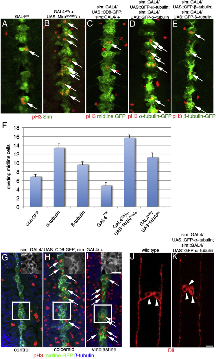 Mechanisms of CNS repair have vital medical implications. We show that traumatic injury to the ventral midline of the embryonic Drosophila CNS activates cell divisions to replace lost cells. A pilot screen analyzing transcriptomes of single cells during repair pointed to downregulation of the microtubule-stabilizing GTPase mitochondrial Rho (Miro) and upregulation of the Jun transcription factor Jun-related antigen (Jra). Ectopic Miro expression can prevent midline divisions after damage, whereas Miro depletion destabilizes cortical β-tubulin and increases divisions. Disruption of cortical microtubules, either by chemical depolymerization or by overexpression of monomeric tubulin, triggers ectopic mitosis in the midline and induces Jra expression. Conversely, loss of Jra renders midline cells unable to replace damaged siblings. Our data indicate that upon injury, the integrity of the microtubule cytoskeleton controls cell division in the CNS midline, triggering extra mitosis to replace lost cells. The conservation of the identified molecules suggests that similar mechanisms may operate in vertebrates.