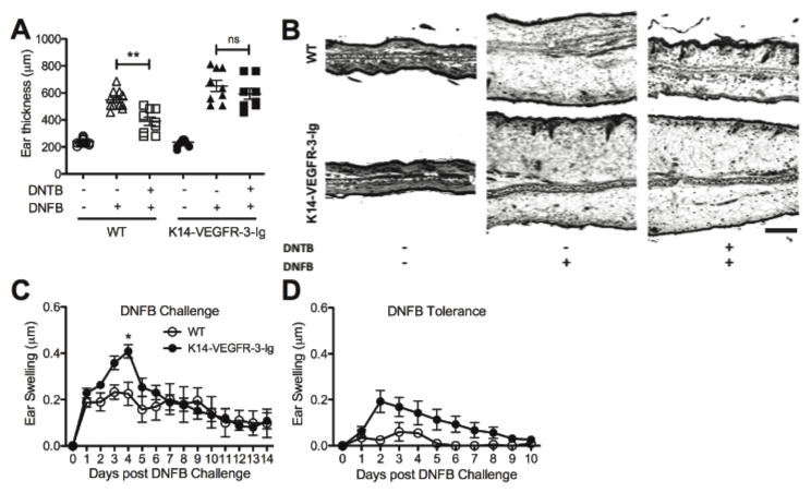 Lymphatic vessels transport interstitial fluid, soluble Ag, and immune cells from peripheral tissues to lymph nodes (LNs), yet the contribution of peripheral lymphatic drainage to adaptive immunity remains poorly understood. We examined immune responses to dermal vaccination and contact hypersensitivity (CHS) challenge in K14-VEGFR-3-Ig mice, which lack dermal lymphatic capillaries and experience markedly depressed transport of solutes and dendritic cells from the skin to draining LNs. In response to dermal immunization, K14-VEGFR-3-Ig mice produced lower Ab titers. In contrast, although delayed, T cell responses were robust after 21 d, including high levels of Ag-specific CD8+ T cells and production of IFN-γ, IL-4, and IL-10 upon restimulation. T cell-mediated CHS responses were strong in K14-VEGFR-3-Ig mice, but importantly, their ability to induce CHS tolerance in the skin was impaired. In addition, 1-y-old mice displayed multiple signs of autoimmunity. These data suggest that lymphatic drainage plays more important roles in regulating humoral immunity and peripheral tolerance than in effector T cell immunity.