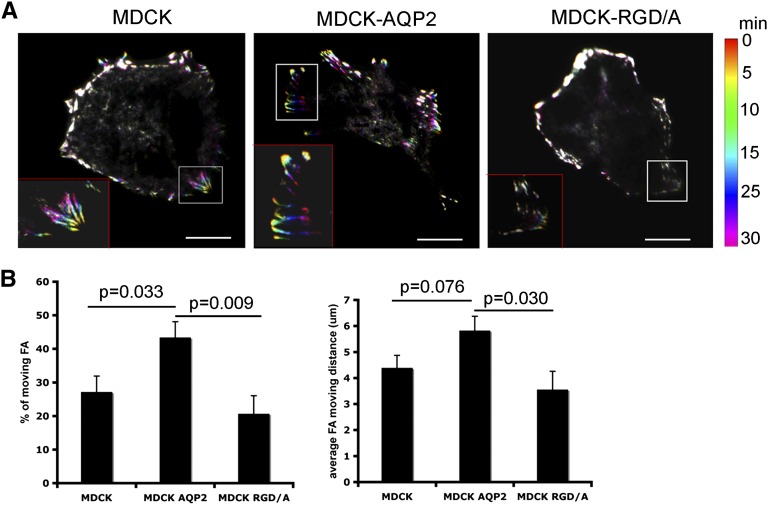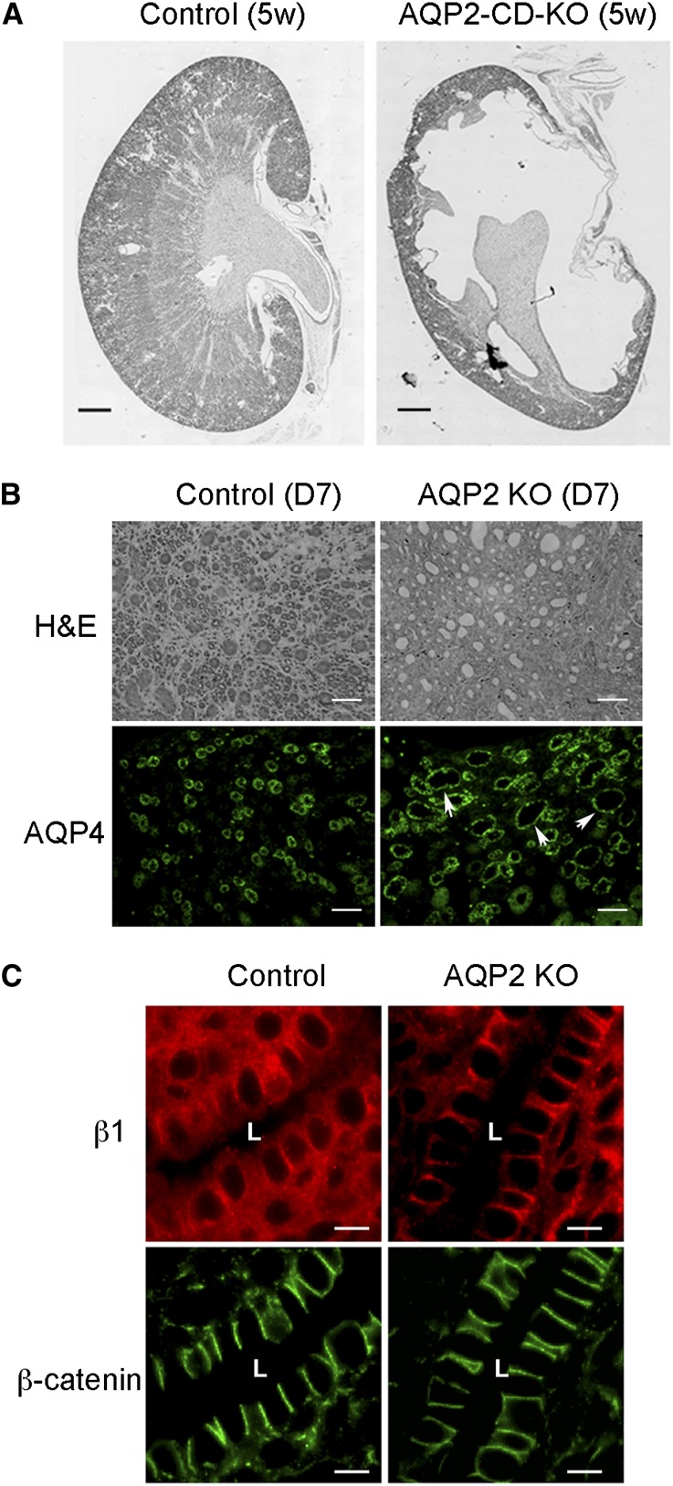 The aquaporin 2 (AQP2) water channel, expressed in kidney collecting ducts, contributes critically to water homeostasis in mammals. Animals lacking or having significantly reduced levels of AQP2, however, have not only urinary concentrating abnormalities but also renal tubular defects that lead to neonatal mortality from renal failure. Here, we show that AQP2 is not only a water channel but also an integrin-binding membrane protein that promotes cell migration and epithelial morphogenesis. AQP2 expression modulates the trafficking and internalization of integrin β1, facilitating its turnover at focal adhesions. In vitro, disturbing the interaction between AQP2 and integrin β1 by mutating the RGD motif led to reduced endocytosis, retention of integrin β1 at the cell surface, and defective cell migration and tubulogenesis. Similarly, in vivo, AQP2-null mice exhibited significant retention of integrin β1 at the basolateral membrane and had tubular abnormalities. In summary, these data suggest that the water channel AQP2 interacts with integrins to promote renal epithelial cell migration, contributing to the structural and functional integrity of the mammalian kidney.