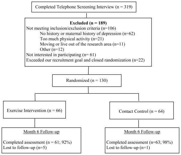 Research indicates that exercise is an efficacious intervention for depression among adults; however, little is known regarding its efficacy for preventing postpartum depression. The Healthy Mom study was a randomized controlled trial examining the efficacy of an exercise intervention for the prevention of postpartum depression. Specifically, postpartum women with a history of depression or a maternal family history of depression (n=130) were randomly assigned to a telephone-based exercise intervention or a wellness/support contact control condition each lasting six months. The exercise intervention was designed to motivate postpartum women to exercise based on Social Cognitive Theory and the Transtheoretical Model. The primary dependent variable was depression based on the Structured Clinical Diagnostic Interview (SCID). Secondary dependent variables included scores on the Edinburgh Postnatal Depression Scale, the PHQ-9, and the Perceived Stress Scale. The purpose of this paper is to describe the study design, methodology, and baseline data for this trial. Upon completion of the trial, the results will yield important information about the efficacy of exercise in preventing postpartum depression.