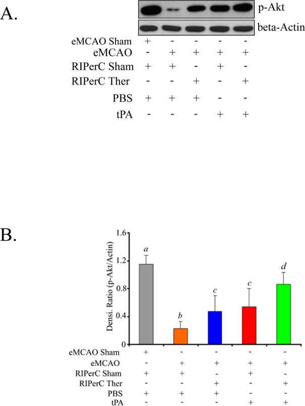Results: RIPerC therapy alone improved the cerebral blood flow and neurological outcomes. tPA alone at 4 hours did not significantly improve the neurological outcome even after successful thrombolysis. Individual treatments with RIPerC and intravenous tPA reduced the infarct size (25.7% and 23.8%, respectively). Combination therapy of RIPerC and tPA resulted in additive effects in further improving the neurological outcome and reducing the infarct size (50%). All the therapeutic treatments upregulated phosphorylation of Akt in the ischemic hemisphere.