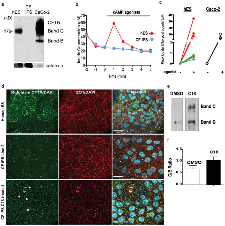 Cystic fibrosis (CF) is a fatal genetic disease caused by mutations in the CFTR (cystic fibrosis transmembrane conductance regulator) gene, which regulates chloride and water transport across all epithelia and affects multiple organs, including the lungs. Here we report an in vitro directed differentiation protocol for generating functional CFTR-expressing airway epithelia from human embryonic stem cells. Carefully timed treatment by exogenous growth factors that mimic endoderm developmental pathways in vivo followed by air-liquid interface culture results in maturation of patches of tight junction–coupled differentiated airway epithelial cells that demonstrate active CFTR transport function. As a proof of concept, treatment of CF patient induced pluripotent stem cell–derived epithelial cells with a small-molecule compound to correct for the common CF processing mutation resulted in enhanced plasma membrane localization of mature CFTR protein. Our study provides a method for generating patient-specific airway epithelial cells for disease modeling and in vitro drug testing.