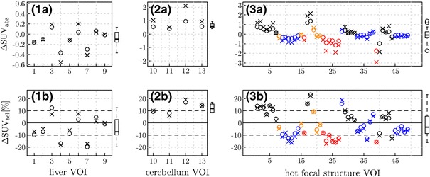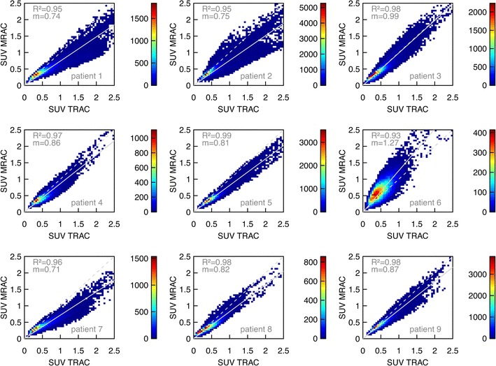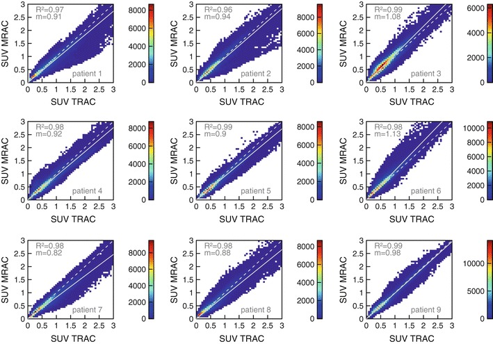 Results: VOI averaged SUV differences between MRAC and TRAC were as follows (relative differences, mean ± standard deviation): (+12 ± 6) % cerebellum, (-4 ± 9) % liver, (-2 ± 11) % hot focal structures. The fitted slopes of the voxel-wise correlations in the lung and trunk were 0.87 ± 0.17 and 0.95 ± 0.10 with averaged adjusted R (2) values of 0.96 and 0.98, respectively. These figures include two instances with partially erroneous lung segmentation due to artifacts in the underlying MR images.