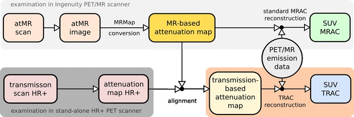 Materials and methods: In 13 patients, PET emission data from the PET/MR were reconstructed using two different methods for attenuation correction. In the first reconstruction, the vendor-provided standard MRAC was used. In the second reconstruction, a coregistered transmission-based attenuation map from a second immediately preceding investigation with a stand-alone Siemens ECAT EXACT HR(+) PET scanner was used (TRAC). The two attenuation maps were compared regarding occurrence of segmentation artifacts in the MRAC procedure. Standard uptake values (SUVs) of multiple VOIs (liver, cerebellum, hot focal structures at various locations in the trunk) were compared between both reconstructed data sets. Furthermore, a voxel-wise intensity correlation analysis of both data sets in the lung and trunk was performed.