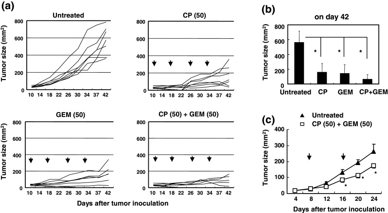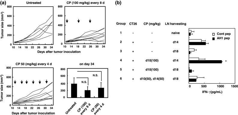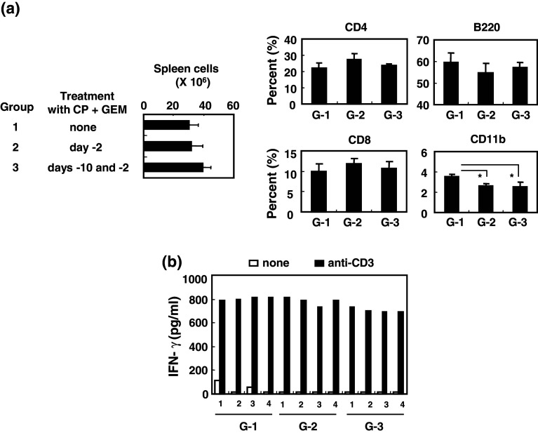 Several chemotherapeutic drugs have immune-modulating effects. For example, cyclophosphamide (CP) and gemcitabine (GEM) diminish immunosuppression by regulatory T cells (Tregs) and myeloid-derived suppressor cells (MDSCs), respectively. Here, we show that intermittent (metronomic) chemotherapy with low-dose CP plus GEM can induce anti-tumor T cell immunity in CT26 colon carcinoma-bearing mice. Although no significant growth suppression was observed by injections of CP (100 mg/kg) at 8-day intervals or those of CP (50 mg/kg) at 4-day intervals, CP injection (100 mg/kg) increased the frequency of tumor peptide-specific T lymphocytes in draining lymph nodes, which was abolished by two injections of CP (50 mg/kg) at a 4-day interval. Alternatively, injection of GEM (50 mg/kg) was superior to that of GEM (100 mg/kg) in suppressing tumor growth in vivo, despite the smaller dose. When CT26-bearing mice were treated with low-dose (50 mg/kg) CP plus (50 mg/kg) GEM at 8-day intervals, tumor growth was suppressed without impairing T cell function; the effect was mainly T cell dependent. The metronomic combination chemotherapy cured one-third of CT26-bearing mice that acquired tumor-specific T cell immunity. The combination therapy decreased Foxp3 and arginase-1 mRNA levels but increased IFN-γ mRNA expression in tumor tissues. The percentages of tumor-infiltrating CD45(+) cells, especially Gr-1(high) CD11b(+) MDSCs, were decreased. These results indicate that metronomic chemotherapy with low-dose CP plus GEM is a promising protocol to mitigate totally Treg- and MDSC-mediated immunosuppression and elicit anti-tumor T cell immunity in vivo.