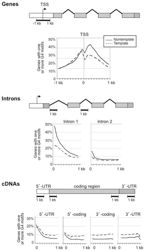 The G4 motif, G(≥3) N(x) G(≥3) N(x) G(≥3) N(x) G(≥3) , is enriched in some genomic regions and depleted in others. This motif confers the ability to form an unusual four-stranded DNA structure, G4 DNA. G4 DNA is associated with genomic instability, which may explain depletion of G4 motifs from some genes and genomic regions. Conversely, G4 motifs are enriched downstream of transcription start sites, where they correlate with pausing. The uneven distribution of G4 motifs in the genome strongly suggests that mechanisms of selection act not only on one-dimensional genomic sequence, but also on structures formed by genomic DNA. The biological roles of G4 structures illustrate that, to understand genome function, it is important to consider the dynamic structural potential implicit in the G4 motif.