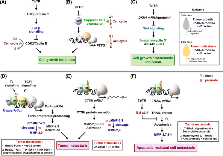 The thyroid hormone 3,3',5-triiodo-L-thyronine (T3) mediates several physiological processes, including embryonic development, cellular differentiation, metabolism, and the regulation of cell proliferation. Thyroid hormone receptors (TRs) generally act as heterodimers with the retinoid X receptor (RXR) to regulate target genes. In addition to their developmental and metabolic functions, TRs have been shown to play a tumor suppressor role, suggesting that their aberrant expression can lead to tumor transformation. Conversely, recent reports have shown an association between overexpression of wild-type TRs and tumor metastasis. Signaling crosstalk between T3/TR and other pathways or specific TR coregulators appear to affect tumor development. Since TR actions are complex as well as cell context-, tissue- and time-specific, aberrant expression of the various TR isoforms has different effects during diverse tumorigenesis. Therefore, elucidation of the T3/TR signaling mechanisms in cancers should facilitate the identification of novel therapeutic targets. This review provides a summary of recent studies focusing on the role of TRs in hepatocellular carcinomas (HCCs).