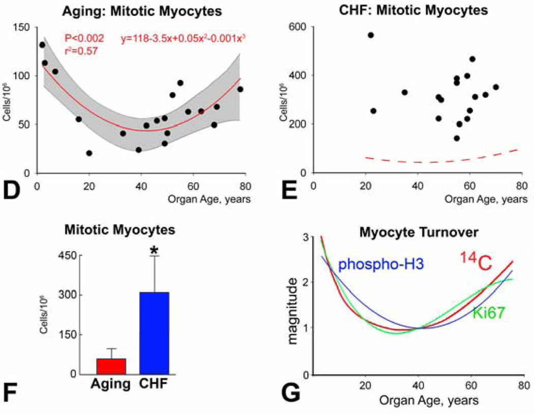Conclusions: The human heart is a highly dynamic organ that retains a remarkable degree of plasticity throughout life and in the presence of chronic heart failure. However, the ability to regenerate cardiomyocytes, vascular ECs, and fibroblasts cannot prevent the manifestations of myocardial aging or oppose the negative effects of ischemic and idiopathic dilated cardiomyopathy.