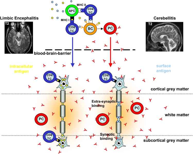 Autoimmune central nervous system (CNS) inflammation occurs both in a paraneoplastic and non-paraneoplastic context. In a widening spectrum of clinical disorders, the underlying adaptive (auto) immune response targets neurons with a divergent role for cellular and humoral disease mechanisms: (1) in encephalitis associated with antibodies to intracellular neuronal antigens, neuronal antigen-specific CD8(+) T cells seemingly account for irreversible progressive neuronal cell death and neurological decline with poor response to immunotherapy. However, a pathogenic effect of humoral immune mechanisms is also debated. (2) In encephalitis associated with antibodies to synaptic and extrasynaptic neuronal cell surface antigens, potentially reversible antibody-mediated disturbance of synaptic transmission and neuronal excitability occurs in the absence of excessive neuronal damage and accounts for a good response to immunotherapy. However, a pathogenic effect of cellular immune mechanisms is also debated. We provide an overview of entities, clinical hallmarks, imaging features, characteristic laboratory, electrophysiological, cerebrospinal fluid and neuropathological findings, cellular and molecular disease mechanisms as well as therapeutic options in these two broad categories of inflammatory CNS disorders.