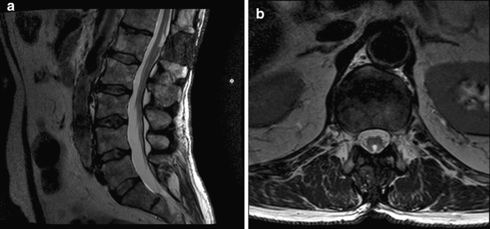 Axial (a) and sagittal (b) T2 weighted MRI at 1-year post-operatively demonstrating resolution of the cord herniation after dural repair and the marsupialised cyst