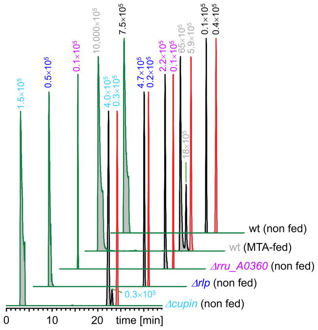 Functional assignment of uncharacterized proteins is a challenge in the era of large-scale genome sequencing. Here, we combine in extracto NMR, proteomics and transcriptomics with a newly developed (knock-out) metabolomics platform to determine a potential physiological role for a ribulose-1,5-bisphosphate carboxylase/oxygenase (RubisCO)-like protein from Rhodospirillum rubrum. Our studies unraveled an unexpected link in bacterial central carbon metabolism between S-adenosylmethionine-dependent polyamine metabolism and isoprenoid biosynthesis and also provide an alternative approach to assign enzyme function at the organismic level.