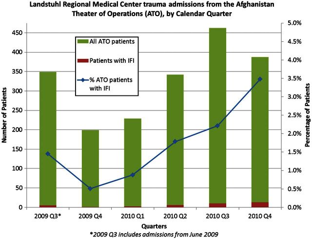 Methods: The patient population includes US military personnel injured during combat from June 2009 through December 2010. Case definition required wound necrosis on successive debridements with IFI evidence by histopathology and/or microbiology (Candida spp excluded). Case finding and data collected through the Trauma Infectious Disease Outcomes Study utilized trauma registry, hospital records or operative reports, and pathologist review of histopathology specimens.