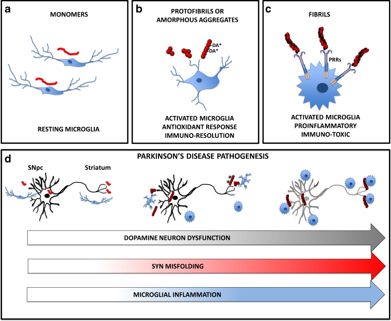 Parkinson's disease (PD) is the second most common age-related neurodegenerative disorder typified by tremor, rigidity, akinesia and postural instability due in part to the loss of dopamine within the nigrostriatal system. The pathologic features of this disorder include the loss of substantia nigra dopamine neurons and attendant striatal terminals, the presence of large protein-rich neuronal inclusions containing fibrillar α-synuclein and increased numbers of activated microglia. Evidence suggests that both misfolded α-synuclein and oxidative stress play an important role in the pathogenesis of sporadic PD. Here we review evidence that α-synuclein activates glia inducing inflammation and that Nrf2-directed phase-II antioxidant enzymes play an important role in PD. We also provide new evidence that the expression of antioxidant enzymes regulated in part by Nrf2 is increased in a mouse model of α-synuclein overexpression. We show that misfolded α-synuclein directly activates microglia inducing the production and release of the proinflammatory cytokine, TNF-α, and increasing antioxidant enzyme expression. Importantly, we demonstrate that the precise structure of α-synuclein is important for induction of this proinflammatory pathway. This complex α-synuclein-directed glial response highlights the importance of protein misfolding, oxidative stress and inflammation in PD and represents a potential locus for the development of novel therapeutics focused on induction of the Nrf2-directed antioxidant pathway and inhibition of protein misfolding.