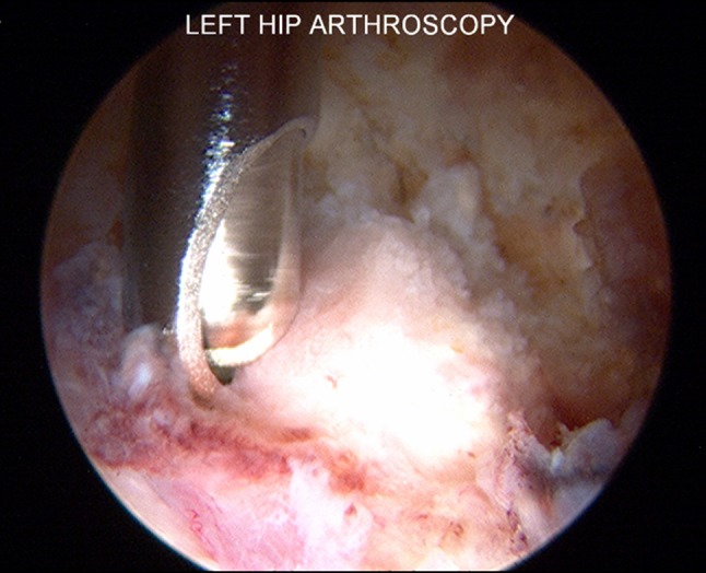 Description of technique: Revision arthroscopy was completed in the central and peripheral compartments using prior portals and fluoroscopy was used to identify the HO. Spinal needle localization was used to triangulate onto the HO. Cannulas were inserted over the spinal needle. Once the HO was clearly identified with the arthroscope, it was excised using a burr and confirmed on fluoroscopy.