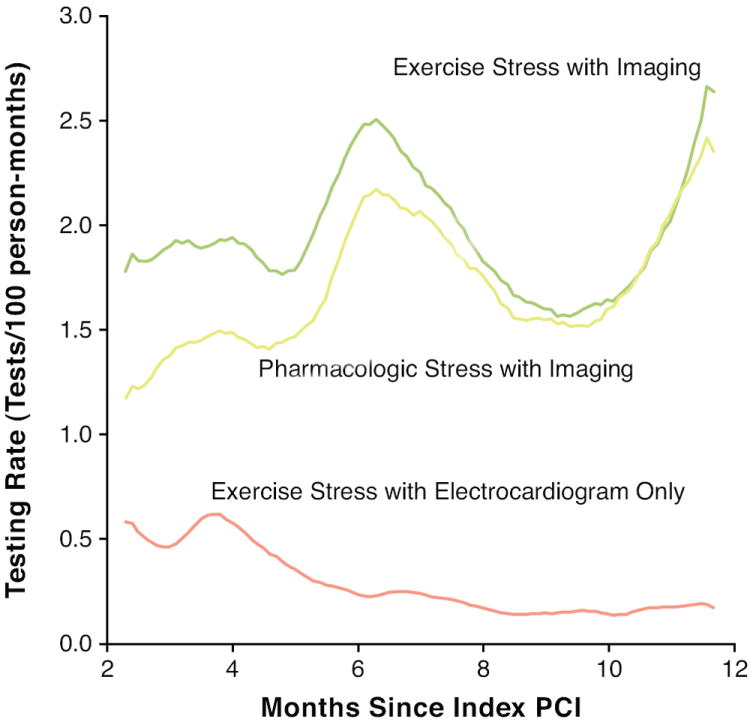 Results: Among 284,971 patients, the overall stress testing rate after PCI was 53.1 per 100 person-years. Testing rates declined from 59.3 in quarter 1 (2006) to 47.1 in quarter 4 (2008), but the relative use of modalities changed little. Among exercise testing recipients, adjusted proportions receiving electrocardiography-only testing varied from 6.8% to 22.8% across Census Divisions; and among exercise testing recipients having an imaging test, the proportion receiving echocardiography (versus nuclear) varied from 9.4% to 34.1%. Post-test procedure use varied among modalities; exercise electrocardiography-only testing was associated with more subsequent stress testing (13.7% vs. 2.9%; p < 0.001), but less catheterization (7.4% vs. 14.1%; p < 0.001) than imaging-based tests.