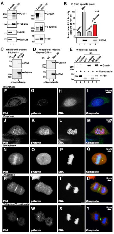 The mitogenic and second-messenger signals that promote cell proliferation often proceed through multienzyme complexes. The kinase-anchoring protein Gravin integrates cAMP and calcium/phospholipid signals at the plasma membrane by sequestering protein kinases A and C with G protein-coupled receptors. In this report we define a role for Gravin as a temporal organizer of phosphorylation-dependent protein-protein interactions during mitosis. Mass spectrometry, molecular, and cellular approaches show that CDK1/Cyclin B1 phosphorylates Gravin on threonine 766 to prime the recruitment of the polo-like kinase Plk1 at defined phases of mitosis. Fluorescent live-cell imaging reveals that cells depleted of Gravin exhibit mitotic defects that include protracted prometaphase and misalignment of chromosomes. Moreover, a Gravin T766A phosphosite mutant that is unable to interact with Plk1 negatively impacts cell proliferation. In situ detection of phospho-T766 Gravin in biopsy sections of human glioblastomas suggests that this phosphorylation event might identify malignant neoplasms.