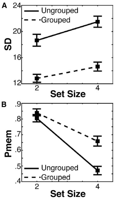 Perceptual grouping can lead observers to perceive a multielement scene as a smaller number of hierarchical units. Past work has shown that grouping enables more elements to be stored in visual working memory (WM). Although this may appear to contradict so-called discrete resource models that argue for fixed item limits in WM storage, it is also possible that grouping reduces the effective number of "items" in the display. To test this hypothesis, we examined how mnemonic resolution declined as the number of items to be stored increased. Discrete resource models predict that precision will reach a stable plateau at relatively early set sizes, because no further items can be stored once putative item limits are exceeded. Thus, we examined whether the precision by set size function was bilinear when storage was enhanced via perceptual grouping. In line with the hypothesis that each perceptual group counted as a single "item," precision still reached a clear plateau at a set size determined by the number of stored groups. Moreover, the maximum number of elements stored was doubled, and electrophysiological measures showed that selection and storage-related neural responses were the same for a single element and a multielement perceptual group. Thus, perceptual grouping allows more elements to be held in working memory while storage is still constrained by a discrete item limit.