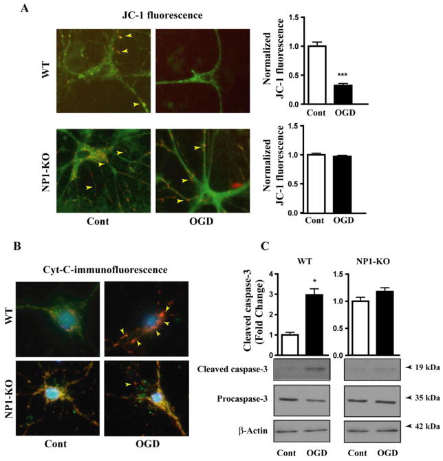 Developing brain is highly susceptible to hypoxic-ischemic (HI) injury leading to severe neurological disabilities in surviving infants and children. Previously, we have reported induction of neuronal pentraxin 1 (NP1), a novel neuronal protein of long-pentraxin family, following HI neuronal injury. Here, we investigated how this specific signal is propagated to cause the HI neuronal death. We used wild-type (WT) and NP1 knockout (NP1-KO) mouse hippocampal cultures, modeled in vitro following exposure to oxygen glucose deprivation (OGD), and in vivo neonatal (P9-10) mouse model of HI brain injury. Our results show induction of NP1 in primary hippocampal neurons following OGD exposure (4-8 h) and in the ipsilateral hippocampal CA1 and CA3 regions at 24-48 h post-HI compared to the contralateral side. We also found increased PTEN activity concurrent with OGD time-dependent (4-8 h) dephosphorylation of Akt (Ser473) and GSK-3β (Ser9). OGD also caused a time-dependent decrease in the phosphorylation of Bad (Ser136), and Bax protein levels. Immunofluorescence staining and subcellular fractionation analyses revealed increased mitochondrial translocation of Bad and Bax proteins from cytoplasm following OGD (4 h) and simultaneously increased release of Cyt C from mitochondria followed by activation of caspase-3. NP1 protein was immunoprecipitated with Bad and Bax proteins; OGD caused increased interactions of NP1 with Bad and Bax, thereby, facilitating their mitochondrial translocation and dissipation of mitochondrial membrane potential (ΔΨ(m)). This NP1 induction preceded the increased mitochondrial release of cytochrome C (Cyt C) into the cytosol, activation of caspase-3 and OGD time-dependent cell death in WT primary hippocampal neurons. In contrast, in NP1-KO neurons there was no translocation of Bad and Bax from cytosol to the mitochondria, and no evidence of ΔΨ(m) loss, increased Cyt C release and caspase-3 activation following OGD; which resulted in significantly reduced neuronal death. Our results indicate a regulatory role of NP1 in Bad/Bax-dependent mitochondrial release of Cyt C and caspase-3 activation. Together our findings demonstrate a novel mechanism by which NP1 regulates mitochondria-driven hippocampal cell death; suggesting NP1 as a potential therapeutic target against HI brain injury in neonates.