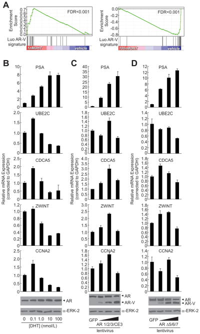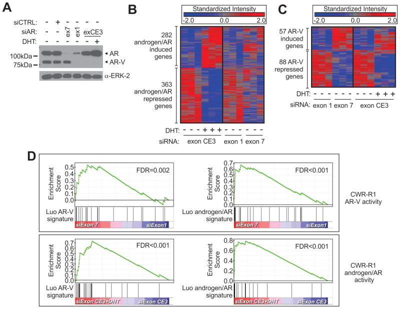 Persistent androgen receptor (AR) transcriptional activity underlies resistance to AR-targeted therapy and progression to lethal castration-resistant prostate cancer (CRPC). Recent success in retargeting persistent AR activity with next generation androgen/AR axis inhibitors such as enzalutamide (MDV3100) has validated AR as a master regulator during all stages of disease progression. However, resistance to next generation AR inhibitors limits therapeutic efficacy for many patients. One emerging mechanism of CRPC progression is AR gene rearrangement, promoting synthesis of constitutively active truncated AR splice variants (AR-V) that lack the AR ligand-binding domain. In this study, we show that cells with AR gene rearrangements expressing both full-length and AR-Vs are androgen independent and enzalutamide resistant. However, selective knock-down of AR-V expression inhibited androgen-independent growth and restored responsiveness to androgens and antiandrogens. In heterogeneous cell populations, AR gene rearrangements marked individual AR-V-dependent cells that were resistant to enzalutamide. Gene expression profiling following knock-down of full-length AR or AR-Vs showed that AR-Vs drive resistance to AR-targeted therapy by functioning as constitutive and independent effectors of the androgen/AR transcriptional program. Further, mitotic genes deemed previously to be unique AR-V targets were found to be biphasic targets associated with a proliferative level of signaling output from either AR-Vs or androgen-stimulated AR. Overall, these studies highlight AR-Vs as key mediators of persistent AR signaling and resistance to the current arsenal of conventional and next generation AR-directed therapies, advancing the concept of AR-Vs as therapeutic targets in advanced disease.
