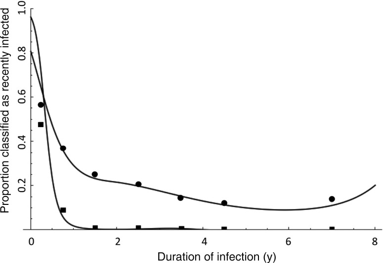 - Brookmeyer R, Quinn TC. Estimation of current human immunodeficiency virus incidence rates from a cross-sectional survey using early diagnostic tests. Am J Epidemiol. 1995;141:166–72. - PubMed