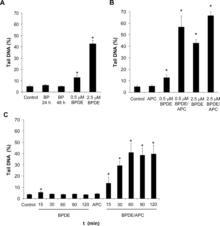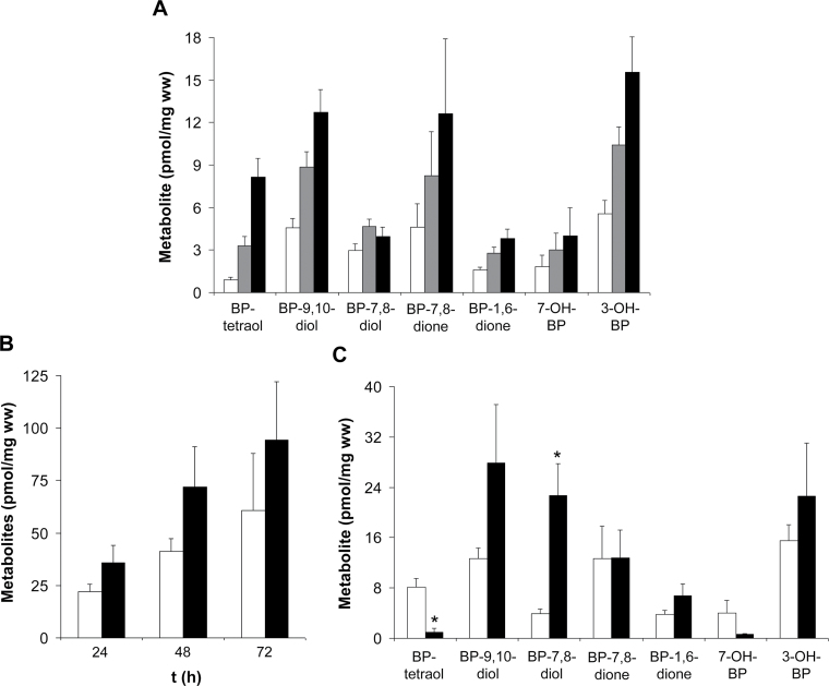 The polycyclic aromatic hydrocarbon (PAH) benzo[a]pyrene (BP) is metabolized into a complex pattern of BP derivatives, among which the ultimate carcinogen (+)-anti-BP-7,8-diol-9,10-epoxide (BPDE) is formed to certain extents. Skin is frequently in contact with PAHs and data on the metabolic capacity of skin tissue toward these compounds are inconclusive. We compared BP metabolism in excised human skin, commercially available in vitro 3D skin models and primary 2D skin cell cultures, and analyzed the metabolically catalyzed occurrence of seven different BP follow-up products by means of liquid chromatography coupled to tandem mass spectrometry (LC-MS/MS). All models investigated were competent to metabolize BP, and the metabolic profiles generated by ex vivo human skin and skin models were remarkably similar. Furthermore, the genotoxicity of BP and its derivatives was monitored in these models via comet assays. In a full-thickness skin, equivalent BP-mediated genotoxic stress was generated via keratinocytes. Cultured primary keratinocytes revealed a level of genotoxicity comparable with that of direct exposure to 50-100 nM of BPDE. Our data demonstrate that the metabolic capacity of human skin ex vivo, as well as organotypic human 3D skin models toward BP, is sufficient to cause significant genotoxic stress and thus cutaneous bioactivation may potentially contribute to mutations that ultimately lead to skin cancer.