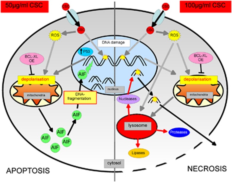 Cigarette smoking is one of the most important and preventable risk factors for atherosclerosis. However, because of the complex composition of cigarette smoke, the detailed pathophysiological mechanisms are not fully understood. Based on controversial reports on the pro-atherogenic activity of cigarette smoke condensate, also called tar fraction (CSC), we decided to analyse the effects of CSC on the viability of endothelial cells in vitro. The results of this study show that low concentrations of the hydrophobic tar fraction induces DNA damage resulting in a P53-dependent and BCL-XL-inhibitable death cascade. Western blot analyses showed that this cascade is caspase-independent and immunofluorescence analysis have shown that the apoptotic death signalling is mediated by the release of apoptosis-inducing factor. Higher CSC concentrations also induce apoptotic-like signalling but the signalling cascade is then redirected to necrosis. Despite the fact that CSC induces a profound increase in cellular reactive oxygen species production, antioxidants exhibit only a minimal cell death protective effect. Our data indicates that not only hydrophilic constituents of cigarette smoke extract, but also CSC is harmful to endothelial cells. The mode and the outcome of CSC-induced cell death signalling are highly concentration dependent: lower concentrations induce caspase-independent apoptosis-like cell death, whereas incubation with higher concentrations interrupts apoptotic signalling and induces necrosis.