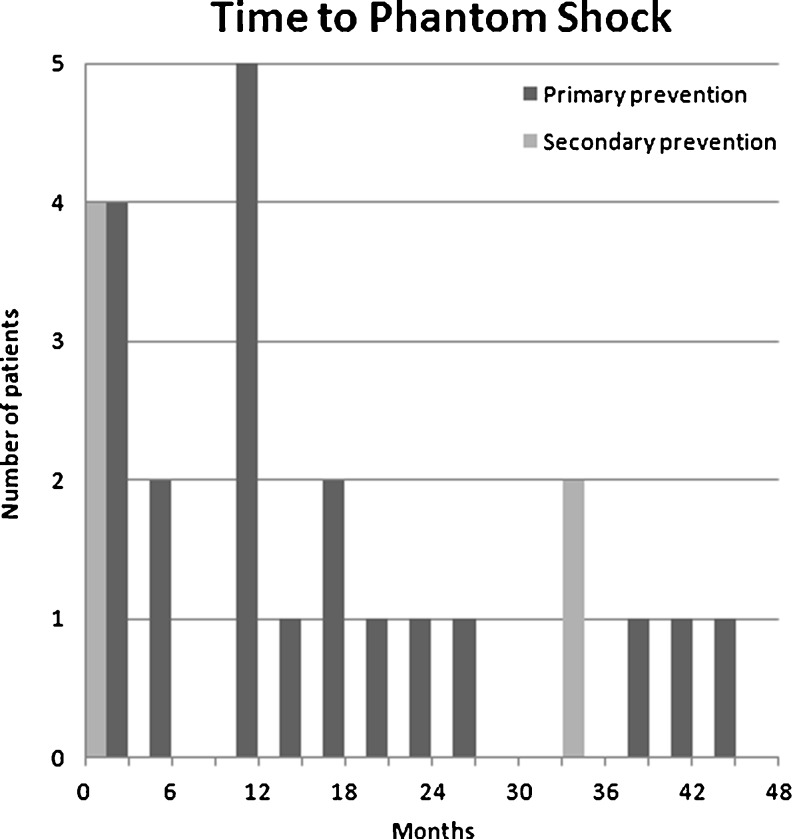 Results: With a median follow-up of 35 months, phantom shocks were reported by 5.1 % of ICD recipients (5.7 % in the primary prevention group and 3.7 % for the secondary prevention group; p=NS). In the combined group of primary and secondary prevention, there were no significant predictors of the occurrence of phantom shocks. However, in the primary prevention group, phantom shocks were related to a history of atrial fibrillation (p=0.03) and NYHA class <III (p=0.05). In the secondary prevention group, there were no significant predictors for phantom shocks.