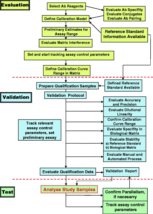 In the last 10 years, the area of ELISA and protein-chip technology has developed and enthusiastically applied to an enormous variety of biological questions. However, the degree of stringency required in data analysis appears to have been underestimated. As a result, there are numerous published findings that are of questionable quality, requiring further confirmation and/or validation. In the course of feasibility and validation studies a number of key issues in research, development and clinical trial studies must be outlined, including those associated with laboratory design, analytical validation strategies, analytical completeness and data managements. The scope of the following review should provide assistance for defining key parameters in assay evaluation and validation in research and clinical trial projects in prospective medicine.