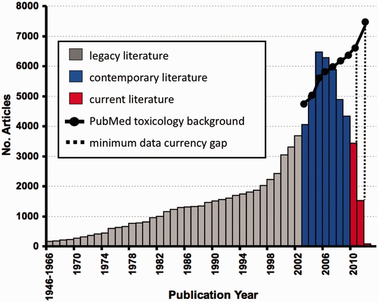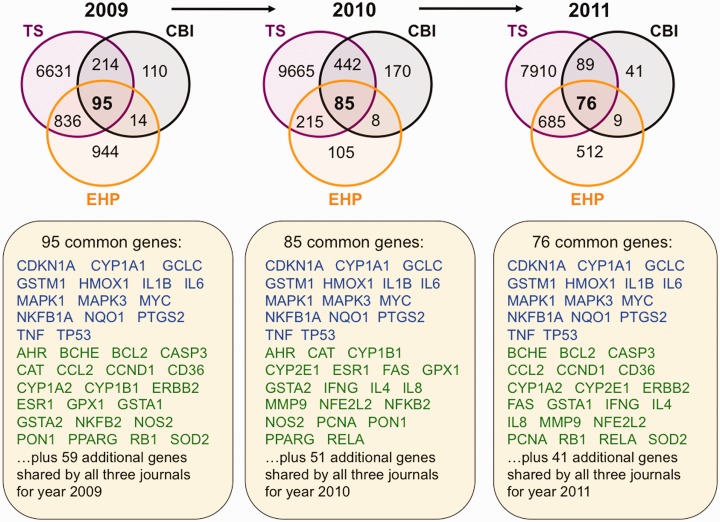 The Comparative Toxicogenomics Database (CTD) is a public resource that promotes understanding about the effects of environmental chemicals on human health. CTD biocurators read the scientific literature and manually curate a triad of chemical-gene, chemical-disease and gene-disease interactions. Typically, articles for CTD are selected using a chemical-centric approach by querying PubMed to retrieve a corpus containing the chemical of interest. Although this technique ensures adequate coverage of knowledge about the chemical (i.e. data completeness), it does not necessarily reflect the most current state of all toxicological research in the community at large (i.e. data currency). Keeping databases current with the most recent scientific results, as well as providing a rich historical background from legacy articles, is a challenging process. To address this issue of data currency, CTD designed and tested a journal-centric approach of curation to complement our chemical-centric method. We first identified priority journals based on defined criteria. Next, over 7 weeks, three biocurators reviewed 2425 articles from three consecutive years (2009-2011) of three targeted journals. From this corpus, 1252 articles contained relevant data for CTD and 52 752 interactions were manually curated. Here, we describe our journal selection process, two methods of document delivery for the biocurators and the analysis of the resulting curation metrics, including data currency, and both intra-journal and inter-journal comparisons of research topics. Based on our results, we expect that curation by select journals can (i) be easily incorporated into the curation pipeline to complement our chemical-centric approach; (ii) build content more evenly for chemicals, genes and diseases in CTD (rather than biasing data by chemicals-of-interest); (iii) reflect developing areas in environmental health and (iv) improve overall data currency for chemicals, genes and diseases. Database URL: http://ctdbase.org/