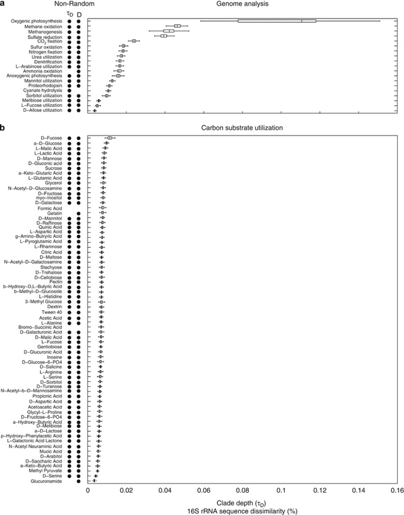 A central question in biology is how biodiversity influences ecosystem functioning. Underlying this is the relationship between organismal phylogeny and the presence of specific functional traits. The relationship is complicated by gene loss and convergent evolution, resulting in the polyphyletic distribution of many traits. In microorganisms, lateral gene transfer can further distort the linkage between phylogeny and the presence of specific functional traits. To identify the phylogenetic conservation of specific traits in microorganisms, we developed a new phylogenetic metric-consenTRAIT-to estimate the clade depth where organisms share a trait. We then analyzed the distribution of 89 functional traits across a broad range of Bacteria and Archaea using genotypic and phenotypic data. A total of 93% of the traits were significantly non-randomly distributed, which suggested that vertical inheritance was generally important for the phylogenetic dispersion of functional traits in microorganisms. Further, traits in microbes were associated with a continuum of trait depths (τD), ranging from a few deep to many shallow clades (average τD: 0.101-0.0011 rRNA sequence dissimilarity). Next, we demonstrated that the dispersion and the depth of clades that contain a trait is correlated with the trait's complexity. Specifically, complex traits encoded by many genes like photosynthesis and methanogenesis were found in a few deep clusters, whereas the ability to use simple carbon substrates was highly phylogenetically dispersed. On the basis of these results, we propose a framework for predicting the phylogenetic conservatism of functional traits depending on the complexity of the trait. This framework enables predicting how variation in microbial composition may affect microbially-mediated ecosystem processes as well as linking phylogenetic and trait-based patterns of biogeography.