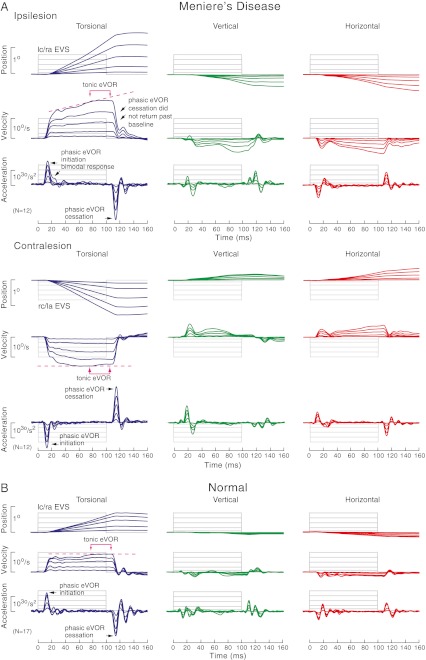 Meniere's disease is characterized by sporadic episodes of vertigo, nystagmus, fluctuating sensorineural hearing loss, tinnitus and aural pressure. Since Meniere's disease can affect different regions of the vestibular labyrinth, we investigated if electrical vestibular stimulation (EVS) which excites the entire vestibular labyrinth may be useful to reveal patchy endorgan pathology. We recorded three-dimensional electrically evoked vestibulo-ocular reflex (eVOR) to transient EVS using bilateral, bipolar 100-ms current steps at intensities of 0.9, 2.5, 5.0, 7.5 and 10.0 mA with dual-search coils in 12 unilateral Meniere's patients. Their results were compared to 17 normal subjects. Normal eVOR had tonic and phasic spatiotemporal properties best described by the torsional component, which was four times larger than horizontal and vertical components. At EVS onset and offset of 8.9 ms latency, there were phasic eVOR initiation (M = 1,267 °/s(2)) and cessation (M = -1,675 °/s(2)) acceleration pulses, whereas during the constant portion of the EVS, there was a maintained tonic eVOR (M = 9.1 °/s) at 10 mA. However in Meniere's disease, whilst latency of EVS onset and offset was normal at 9.0 ms, phasic eVOR initiation (M = 1,720 °/s(2)) and cessation (M = -2,523 °/s(2)) were enlarged at 10 mA. The initiation profile was a bimodal response, whilst the cessation profile frequently did not return to baseline. The tonic eVOR (M = 20.5 °/s) exhibited a ramped enhancement of about twice normal at 10 mA. Tonic eVOR enhancement was present for EVS >0.9 mA and disproportionately enhanced the torsional, vertical and horizontal components. These eVOR abnormalities may be a diagnostic indicator of Meniere's disease and may explain the vertigo attacks in the presence of declining mechanically evoked vestibular responses.