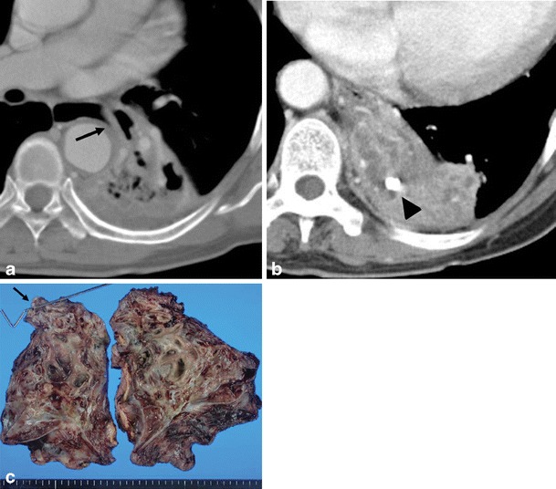 Teaching points: • Important risk factors for thoracic actinomycosis are underlying respiratory disorders such as emphysema and chronic bronchitis. • Different CT patterns can be distinguished in thoracic actinomycosis: parenchymal, bronchiectatic, endobronchial and extrapulmonary. • Typical CT findings in the parenchymal pattern are a central low density within the parenchymal consolidation and adjacent pleural thickening.