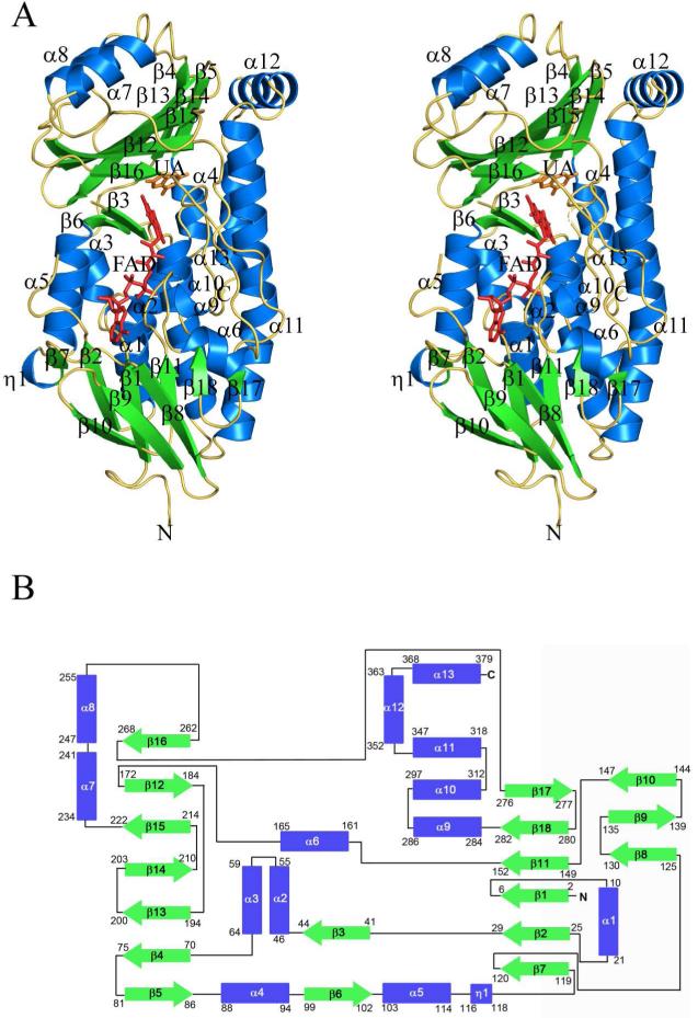 Structure of HpxO. (A) Stereoview ribbon diagram of HpxO with FAD and uric acid bound and secondary structural elements labeled. The α-helices are shown in blue and the β-strands are shown in green with loops colored yellow. Ligands are shown in stick representation: FAD is colored red and uric acid is labeled as “UA” and is colored orange. (B) Topology diagram of HpxO. The color scheme is the same as Figure 2A.