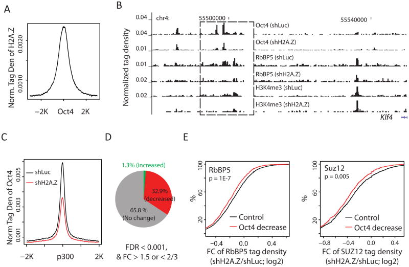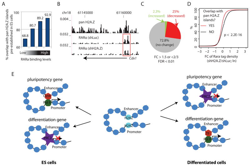 Chromatin modifications have been implicated in the self-renewal and differentiation of embryonic stem cells (ESCs). However, the function of histone variant H2A.Z in ESCs remains unclear. We show that H2A.Z is highly enriched at promoters and enhancers and is required for both efficient self-renewal and differentiation of murine ESCs. H2A.Z deposition leads to an abnormal nucleosome structure, decreased nucleosome occupancy, and increased chromatin accessibility. In self-renewing ESCs, knockdown of H2A.Z compromises OCT4 binding to its target genes and leads to decreased binding of MLL complexes to active genes and of PRC2 complex to repressed genes. During differentiation of ESCs, inhibition of H2A.Z also compromises RA-induced RARα binding, activation of differentiation markers, and the repression of pluripotency genes. We propose that H2A.Z mediates such contrasting activities by acting as a general facilitator that generates access for a variety of complexes, both activating and repressive.