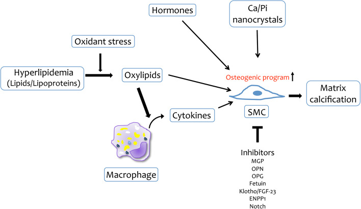 Vascular calcification is a common feature of chronic kidney disease, cardiovascular disease, and aging. Such abnormal calcium deposition occurs in medial and/or intimal layers of blood vessels as well as in cardiac valves. Once considered a passive and inconsequential finding, the presence of calcium deposits in the vasculature is widely accepted as a predictor of increased morbidity and mortality. Recognition of the importance of vascular calcification in health is driving research into mechanisms that govern its development, progression, and regression. Diverse, but highly interconnected factors, have been implicated, including disturbances in lipid metabolism, oxidative stress, inflammatory cytokines, and mineral and hormonal balances, which can lead to formation of osteoblast-like cells in the artery wall. A tight balance of procalcific and anticalcific regulators dictates the extent of disease. In this review, we focus on the main regulatory circuits modulating vascular cell calcification.