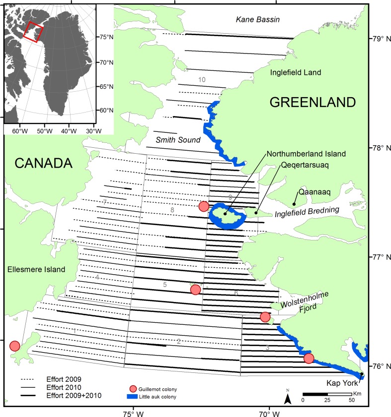The North Water polynya (~76°N to 79°N and 70°W to 80°W) is known to be an important habitat for several species of marine mammals and sea birds. For millennia, it has provided the basis for subsistence hunting and human presence in the northernmost part of Baffin Bay. The abundance of air-breathing top predators also represents a potential source of nutrient cycling that maintains primary production. In this study, aerial surveys conducted in 2009 and 2010 were used for the first time to map the distribution and estimate the abundance of top predators during spring in the North Water. Belugas (Delphinapterus leucas) were not detected north of 77°20'N but were found along the coast of West Greenland and offshore in the middle of the North Water with an abundance estimated at 2245 (95 % CI 1811-2783). Narwhals (Monodon monoceros) were widely distributed on the eastern side of the North Water with an estimate of abundance of 7726 (3761-15 870). Walruses (Odobenus rosmarus) were found across the North Water over both shallow and deep (>500 m) water with an estimated abundance of 1499 (1077-2087). Bearded (Erignathus barbatus) and ringed seals (Phoca hispida) used the large floes of ice in the southeastern part of the North Water for hauling out. Most polar bears (Ursus maritimus) were detected in the southern part of the polynya. The abundances of bearded and ringed seals were 6016 (3322-10 893) and 9529 (5460-16 632), respectively, and that of polar bears was 60 (12-292). Three sea bird species were distributed along the Greenland coast (eiders, Somateria spp.), in leads and cracks close to the Greenland coast (little auks, Alle alle) or widely in open water (thick-billed guillemots, Uria lomvia).