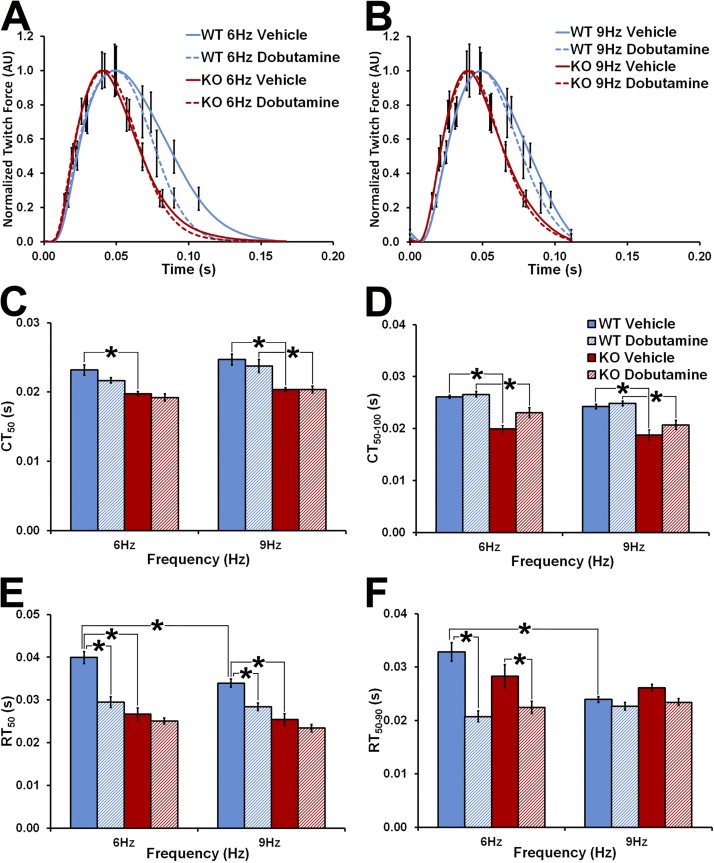 Hypertrophic cardiomyopathy (HCM) caused by mutations in cardiac myosin-binding protein-C (cMyBP-C) is a heterogenous disease in which the phenotypic presentation is influenced by genetic, environmental, and developmental factors. Though mouse models have been used extensively to study the contractile effects of cMyBP-C ablation, early postnatal hypertrophic and dilatory remodeling may overshadow primary contractile defects. The use of a murine engineered cardiac tissue (mECT) model of cMyBP-C ablation in the present study permits delineation of the primary contractile kinetic abnormalities in an intact tissue model under mechanical loading conditions in the absence of confounding remodeling events. We generated mechanically integrated mECT using isolated postnatal day 1 mouse cardiac cells from both wild-type (WT) and cMyBP-C-null hearts. After culturing for 1 wk to establish coordinated spontaneous contraction, we measured twitch force and Ca(2+) transients at 37°C during pacing at 6 and 9 Hz, with and without dobutamine. Compared with WT, the cMyBP-C-null mECT demonstrated faster late contraction kinetics and significantly faster early relaxation kinetics with no difference in Ca(2+) transient kinetics. Strikingly, the ability of cMyBP-C-null mECT to increase contractile kinetics in response to adrenergic stimulation and increased pacing frequency were severely impaired. We conclude that cMyBP-C ablation results in constitutively accelerated contractile kinetics with preserved peak force with minimal contractile kinetic reserve. These functional abnormalities precede the development of the hypertrophic phenotype and do not result from alterations in Ca(2+) transient kinetics, suggesting that alterations in contractile velocity may serve as the primary functional trigger for the development of hypertrophy in this model of HCM. Our findings strongly support a mechanism in which cMyBP-C functions as a physiological brake on contraction by positioning myosin heads away from the thin filament, a constraint which is removed upon adrenergic stimulation or cMyBP-C ablation.