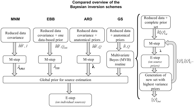 Electro- and magnetoencephalography allow for non-invasive investigation of human brain activation and corresponding networks with high temporal resolution. Still, no correct network detection is possible without reliable source localization. In this paper, we examine four different source localization schemes under a common Variational Bayesian framework. A Bayesian approach to the Minimum Norm Model (MNM), an Empirical Bayesian Beamformer (EBB) and two iterative Bayesian schemes (Automatic Relevance Determination (ARD) and Greedy Search (GS)) are quantitatively compared. While EBB and MNM each use a single empirical prior, ARD and GS employ a library of anatomical priors that define possible source configurations. The localization performance was investigated as a function of (i) the number of sources (one vs. two vs. three), (ii) the signal to noise ratio (SNR; 5 levels) and (iii) the temporal correlation of source time courses (for the cases of two or three sources). We also tested whether the use of additional bilateral priors specifying source covariance for ARD and GS algorithms improved performance. Our results show that MNM proves effective only with single source configurations. EBB shows a spatial accuracy of few millimeters with high SNRs and low correlation between sources. In contrast, ARD and GS are more robust to noise and less affected by temporal correlations between sources. However, the spatial accuracy of ARD and GS is generally limited to the order of one centimeter. We found that the use of correlated covariance priors made no difference to ARD/GS performance.