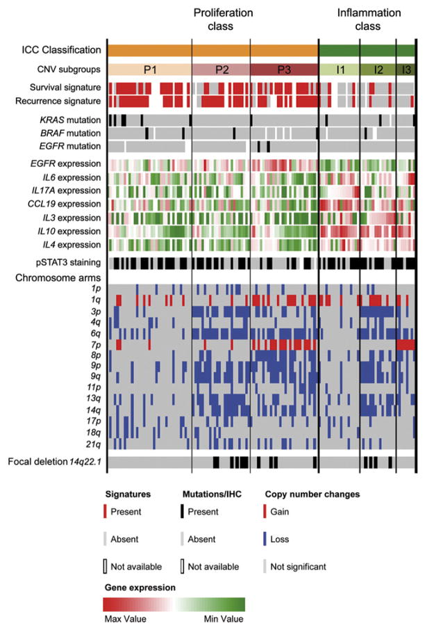 Conclusions: We used an integrative genomic analysis to identify 2 classes of ICC. The proliferation class has specific copy number alterations, activation of oncogenic pathways, and is associated with worse outcome. Different classes of ICC, based on molecular features, therefore might require different treatment approaches.