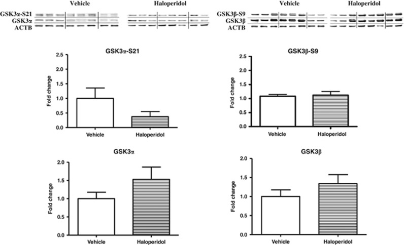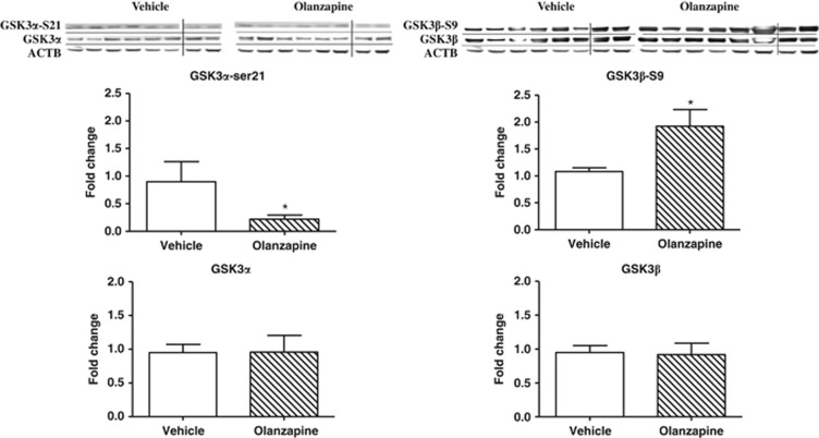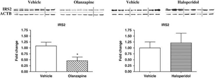 The pathogenesis of antipsychotic-induced disturbances of glucose homeostasis is still unclear. Increased visceral adiposity has been suggested to be a possible mediating mechanism. The aim of this study was to investigate, in an animal model, the differential effects of olanzapine and haloperidol on visceral fat deposition (using magnetic resonance imaging(MRI)) and on critical nodes of the insulin signaling pathway (liver-protein levels of IRS2 (insulin receptor substrate 2), GSK3α (glycogen synthase kinase-3α), GSK3β, GSK3α-Ser21, GSK3β-Ser9). To this end, we studied male Sprague-Dawley rats treated with vehicle (n=8), haloperidol (2 mg kg(-1) per day, n=8), or olanzapine (10 mg kg(-1)per day, n=8), using osmotic minipumps, for 8 weeks. The haloperidol group showed a higher percentage of visceral fat than both the olanzapine group and the vehicle group, whereas there was no difference between the olanzapine and the vehicle group. In terms of insulin signaling pathway, the olanzapine group showed significantly reduced IRS2 levels, reduced phosphorylation of GSK3α and increased phosphorylation of GSK3β, whereas there was no difference between the haloperidol and the vehicle group. Our data suggest that different molecular pathways mediate the disturbances of glucose homeostasis induced by haloperidol and olanzapine with a direct effect of olanzapine on the insulin molecular pathway, possibly partly explaining the stronger propensity of olanzapine for adverse effects on glucose regulation when compared with haloperidol in clinical settings.